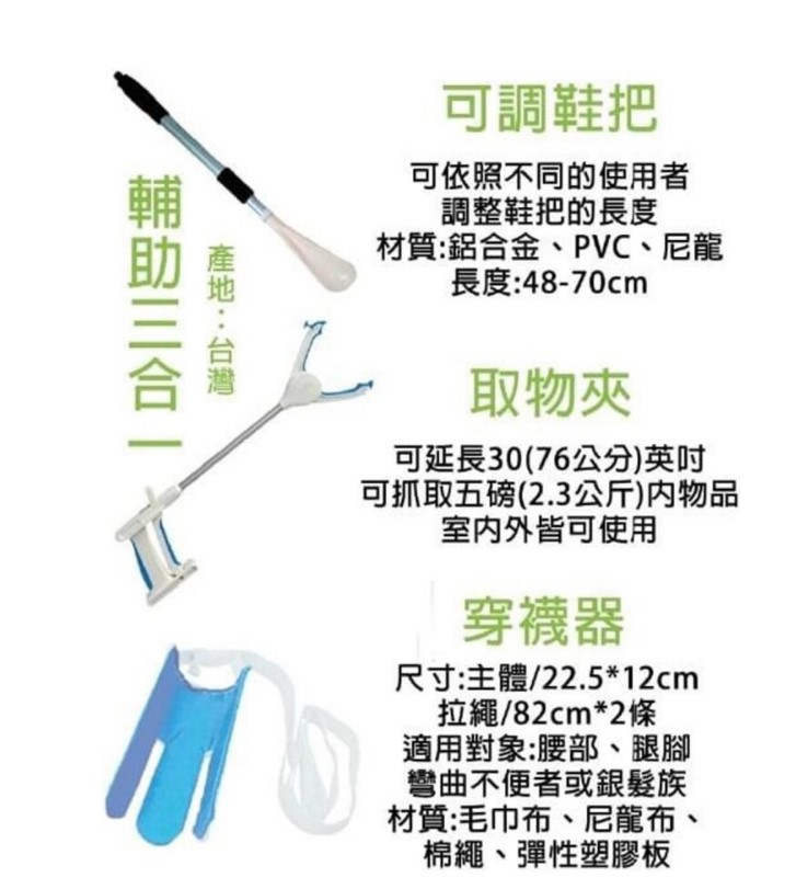產品特性: ◆ 台灣製造 ◆ 可調鞋把:可依照不同的使用者調整鞋把的長度 ◆ 取物夾:可延長30英吋(76公分) 可抓取5磅(2.3公斤)內的物品 ◆ 穿襪器:適用腰部 腿部 彎曲不便者或銀髮族 產品規格: ◆ 材質: - 取物夾&鞋把:鋁合金、PVC、尼龍 - 穿襪器:毛巾布、尼龍布、棉繩、彈性塑膠板 ◆ 尺寸&承重: - 鞋把:48-70cm - 取物夾:可延長30英吋(76公分) 可抓取5磅(2.3公斤)內的物品 - 穿襪器:主體22.5x12cm / 拉繩82cmx2條 ◆ 產地:台灣